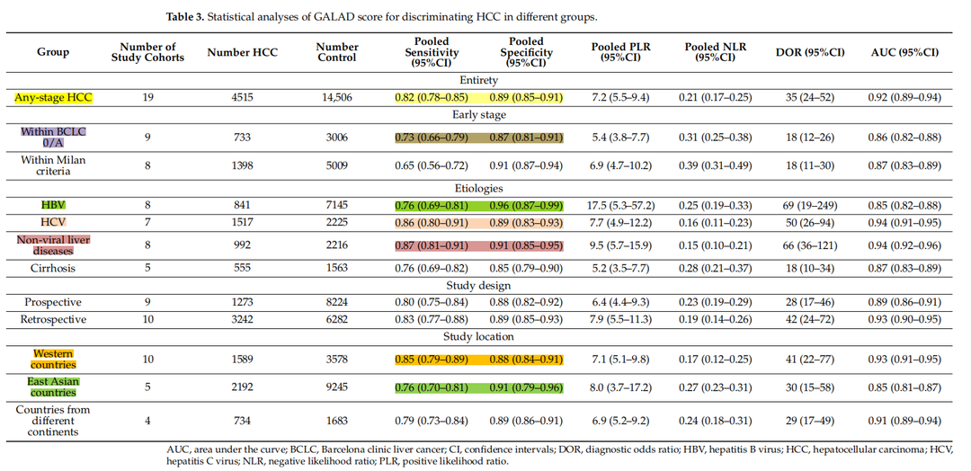 對于識別巴塞羅那臨床肝癌分期(BCLC)0/A期HCC,GALAD模型表現出良好的診斷準確性,敏感度為0.73,特異性為0.87。針對不同病因引發的肝癌,GALAD模型在乙肝、丙肝及非病毒性肝病相關的肝癌檢測中,其敏感度依次為0.76、0.86和0.87,特異性則為0.96、0.89和0.91。