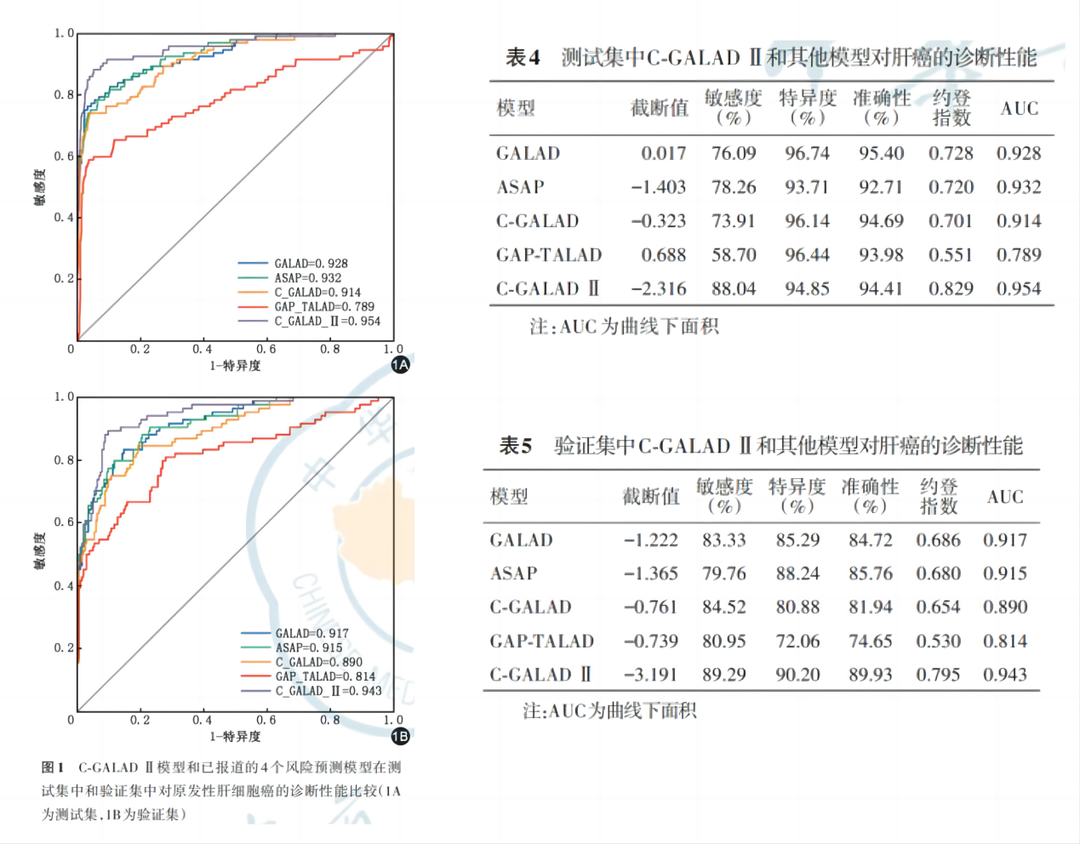 C-GALAD Ⅱ模型不僅保留了原有GALAD模型的優勢,還納入了更多影響因素,提升了對中國人群的適應性和診斷準確性。實證結果顯示,無論是內部測試集還是外部獨立驗證集,C-GALAD Ⅱ模型的ROC曲線下面積(AUC)高達0.954和0.943,敏感度分別為88.04%和89.29%,特異性分別為94.85%和90.2%,這些性能參數均優于其他已報道模型。