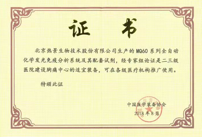 早在2018年,MQ60系列全自動化學發光免疫分析系統及其配套試劑通過中國醫學裝備協會組織國內檢驗、心內和急診等領域知名專家技術論證,一致認為該設備滿足急診對高質量檢測結果的要求,性能穩定可靠,操作簡單快速,符合質控要求,不依賴其它設備或繁瑣前處理,可對各類樣品進行檢測,滿足二三級醫院建設胸痛中心的要求,適合各級醫療機構推廣應用。