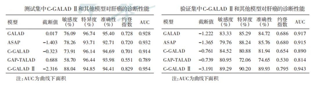 在測試集上驗(yàn)證C-GALAD Ⅱ所得AUC為 0.954,敏感度為88.04%,特異度為94.85%;在外部獨(dú)立驗(yàn)證集的C-GALAD Ⅱ所得AUC為0.943,敏感度為89.29%,特異度為90.2%,性能優(yōu)于其他已發(fā)表模型。