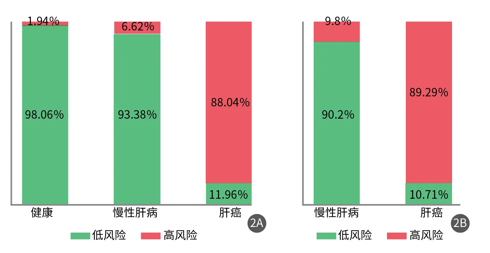 圖2 C-GALAD Ⅱ模型在測試集和驗(yàn)證集中不同人群的預(yù)測結(jié)果分布(2A為測試集,2B為驗(yàn)證集)