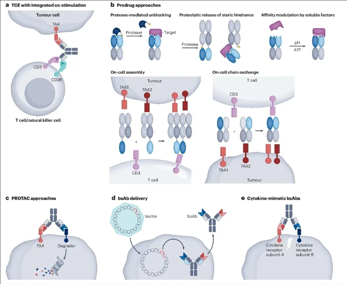 目前,人們正在研究越來越多的針對癌癥治療的不同類型的bsAbs。這些類型包括雙靶向抑制劑,其作用于不同水平的腫瘤增殖、血管形成和轉(zhuǎn)移;以及雙特異性抗體偶聯(lián)藥物、T細(xì)胞結(jié)合器、雙特異性自然殺傷細(xì)胞接合器(NKCE)和先天免疫細(xì)胞接合器。其他類型還包括雙特異性免疫檢查點抑制劑(CPI)、共刺激bsAbs和融合蛋白、具有聯(lián)合檢查點抑制和共刺激特征的bsAbs、在腫瘤微環(huán)境(TME)中特異性激活的bsAb,以及將過繼T細(xì)胞治療和治療性抗體相結(jié)合的新方法。