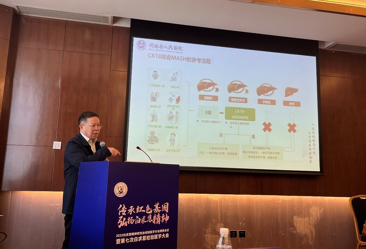 河南省人民醫院消化內科李修嶺教授作《代謝相關脂肪性肝?。∕AFLD)篩查路徑新選擇》主題報告。在報告中,李教授全面解析了CK18作為MASH特異性生物標志物的循證依據,展示了豐富的國內外研究成果數據,明確了CK18可作為MAFLD與MASH鑒別診斷的有效工具。李教授強調,該指標因其無創非侵入式、可及性、經濟性的特點,與肝酶檢測兩者互相彌補,能夠更精準評估肝炎程度,鑒別MAFLD與MASH,使診斷更敏感有效。