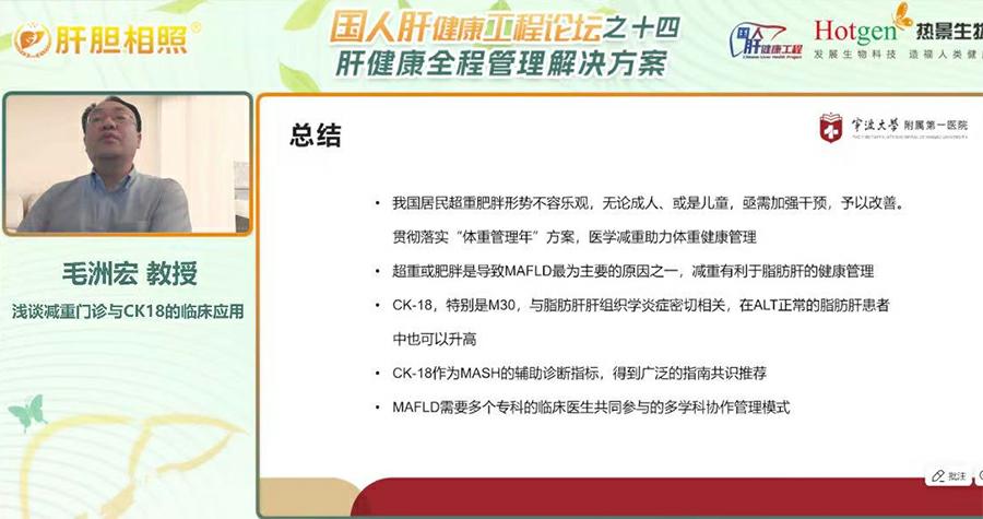 寧波大學(xué)附屬第一醫(yī)院內(nèi)分泌科毛洲宏教授在會議上圍繞“減重門診與CK18的臨床應(yīng)用”作專題報告,強(qiáng)調(diào)國家衛(wèi)健委“體重管理年”政策推動下,醫(yī)療機(jī)構(gòu)需加強(qiáng)減重門診建設(shè),為超重及肥胖人群提供專業(yè)化服務(wù)。毛教授也以本院“肥胖俱樂部”在開設(shè)近十年的真實經(jīng)驗,給我們科普了減重管理的重要性。目前,我國超重肥胖形勢嚴(yán)峻,超50%成人存在體重異常,肥胖與代謝相關(guān)脂肪性肝病(MAFLD)密切相關(guān),約20% MAFLD患者可能進(jìn)展為脂肪性肝炎(MASH),T2DM患者合并MAFLD比例高達(dá)65.04%。毛教授指出,傳統(tǒng)檢測手段如ALT、B超在早期診斷MASH及纖維化中存在局限性,而細(xì)胞角蛋白18(CK-18)片段作為新型生物標(biāo)志物,通過M30/M65片段可無創(chuàng)評估肝細(xì)胞凋亡與壞死,其敏感性與特異性顯著優(yōu)于傳統(tǒng)指標(biāo)。此外,MAFLD需多學(xué)科協(xié)作管理,結(jié)合減重、改善代謝、抗纖維化等綜合干預(yù)措施,定期監(jiān)測高危人群。毛教授總結(jié)稱,CK18的應(yīng)用將推動MAFLD精準(zhǔn)診療,而政策支持與多學(xué)科模式普及,為肥胖及相關(guān)代謝疾病防控注入新動力。