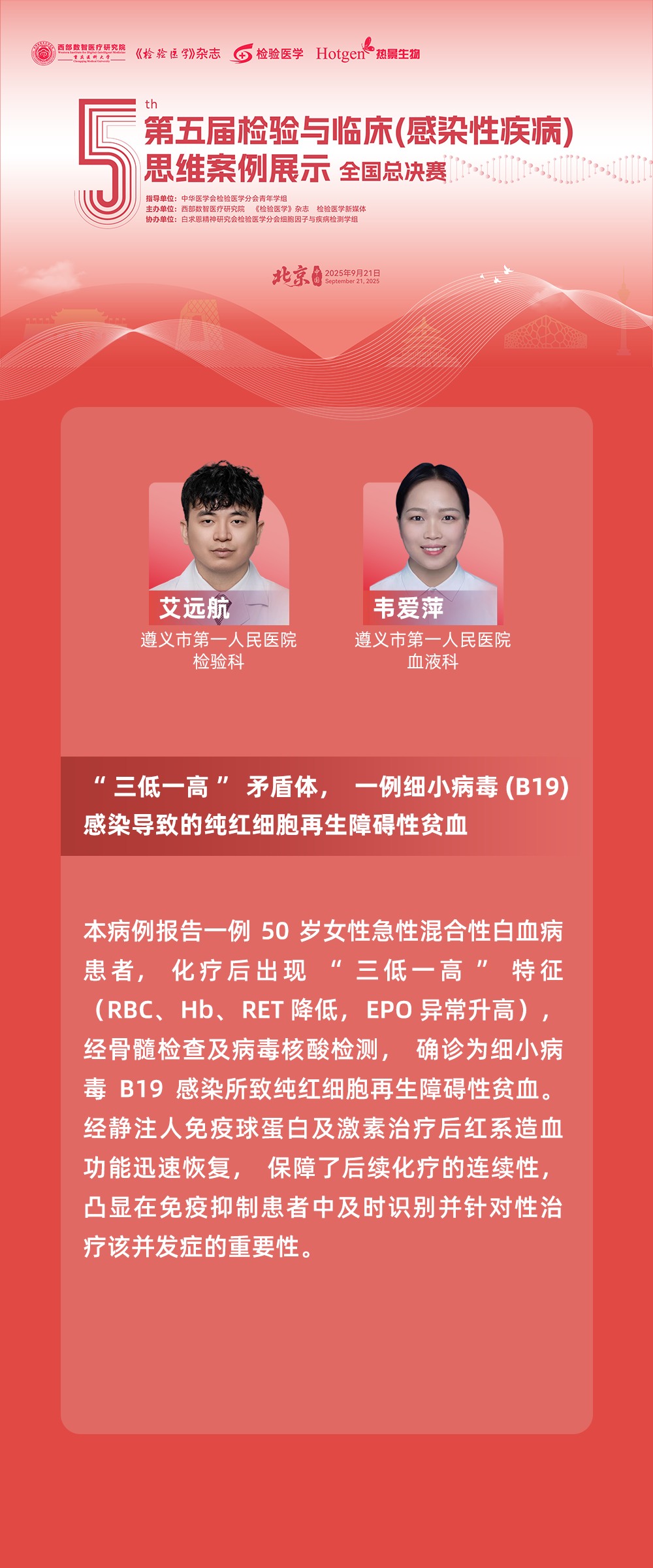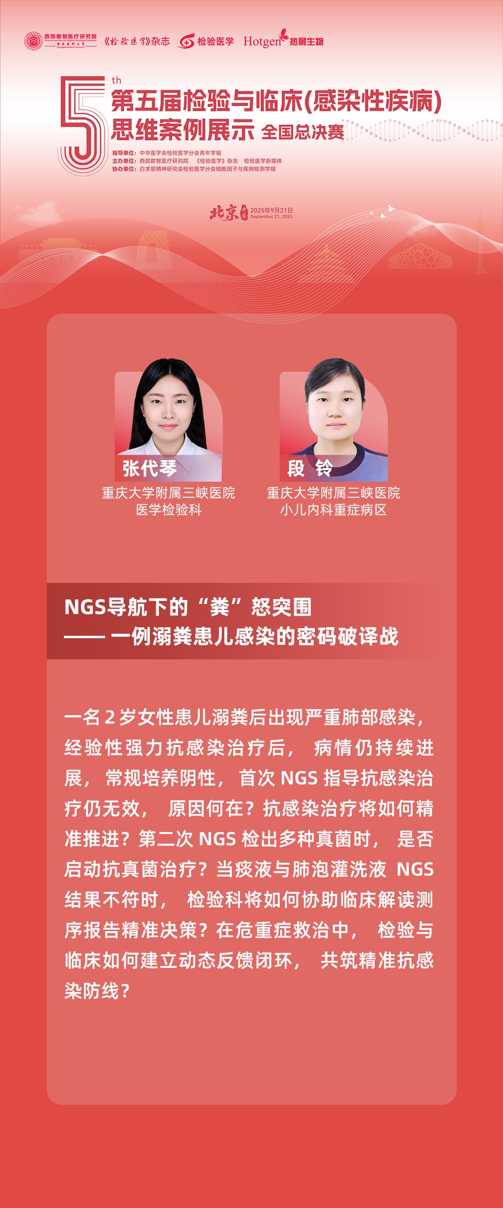 為了更有效地推進檢驗與臨床之間的溝通,促進跨學科交流與合作,實現檢驗與臨床的融合發展,在大會召開期間,舉辦了檢驗與臨床思維案例展示活動暨“2025年全國檢驗與臨床思維案例展示總決賽”。其中,由熱景生物支持的“第五屆檢驗與臨床(感染性疾病)思維案例展示全國總決賽”冠軍組案例,即來自遵義市第一人民醫院的《“三低一高”矛盾體,一例細小病毒(B19)感染導致的純紅細胞再生障礙性貧血》、重慶大學附屬三峽醫院的《NGS導航下的“糞”怒突圍——一例溺糞患兒感染的密碼破譯戰》案例入選“2025年全國檢驗與臨床思維案例展示總決賽”。